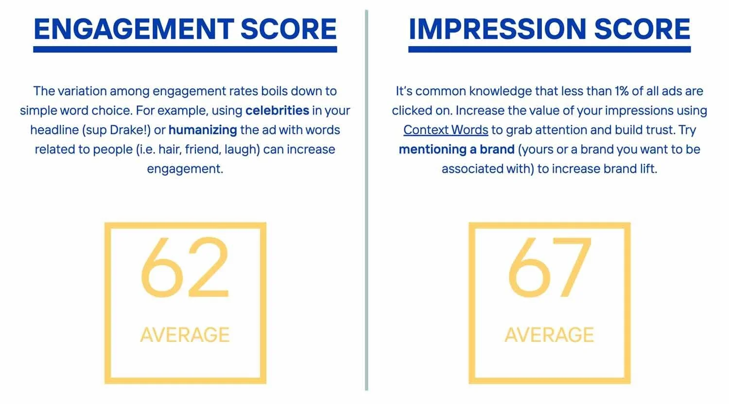 Sharethrough helps you optimize your headlines by providing a “Headline Quality Score” that consists of an Engagement Score and an Impression Score.