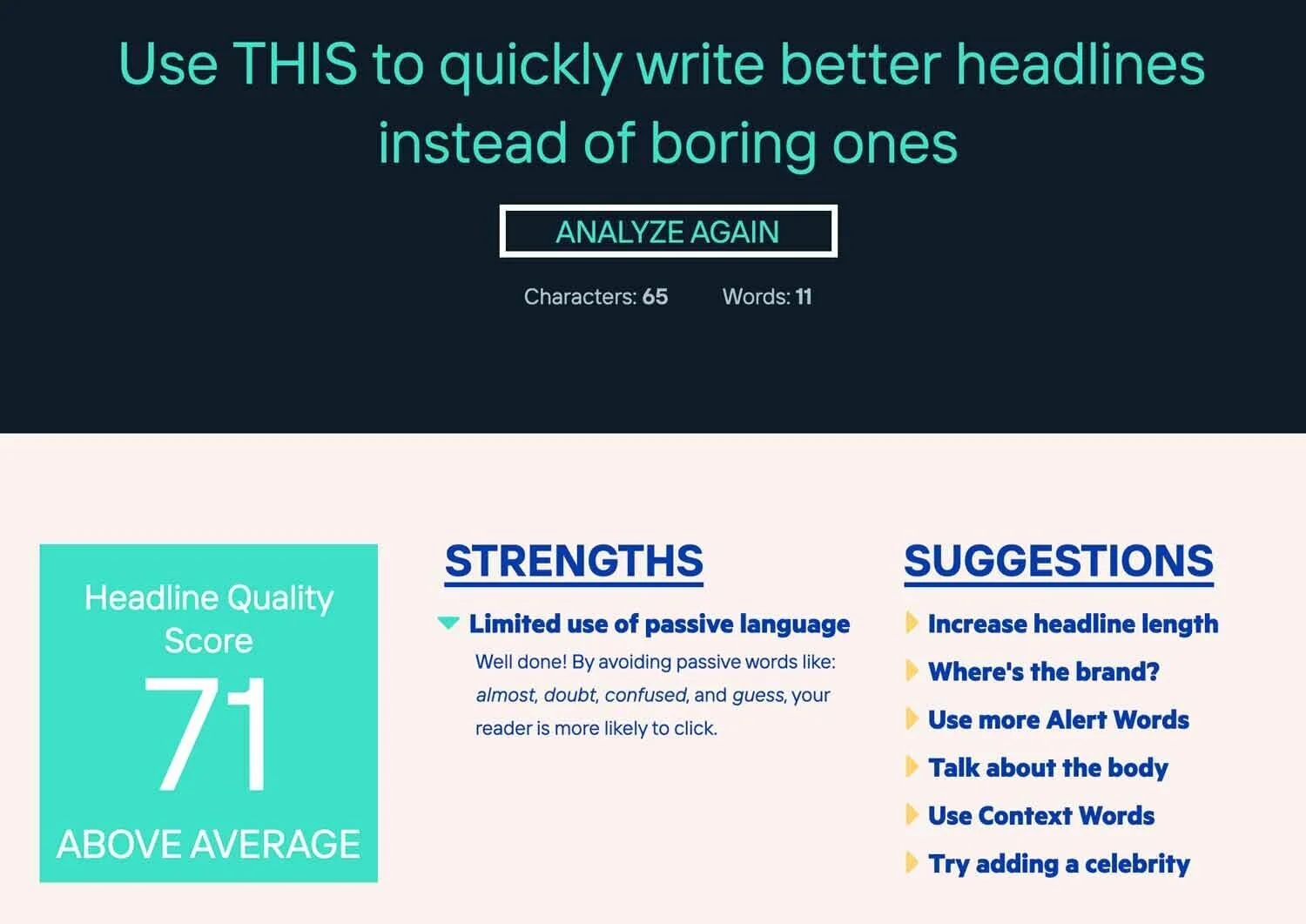 You can test variations of your headline to see which ranks higher according to their algorithm. They also link to a recommended list of context words that you can use to write more engaging headlines.